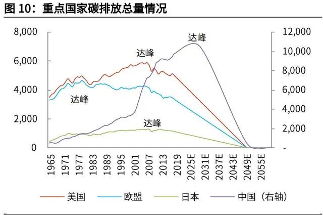 为什么“新冠疫情”后,我国推动“碳中和”更加迅速?——增加国际声誉和话语权。2019 年我国碳排放量达 98.26 亿吨位列全球第一,自 2005 年以来为全球碳排放总量最高的国家(加入世贸组织后,全球产业链分工变化所致)。近年来我国碳排放增速已有所放缓,但较为庞大的人口基数使得我国碳排放全球占比仍在持续提升,2019 年达 28.76%。而针对“新冠疫情”源头问题,经常有部分西方国家和人员因政治原因公开抹黑中国。而加速推动“碳中和”将助力我国树立负责任的大国形象,在国际气候法 律秩序构建中争取获得“话语权”,并掌握未来全球“游戏规则”的主动权和制 定权。目前,全人类气候目标竞赛已经开启,根据 EnergyClimate 机构推出的净零排 放竞赛计分卡,目前我国已处于第四梯队,位列全球第 28 位。3)“碳中和”的统一性:全球难得的政策与利益一致点从全球来看,多数国家已更新 NDC(国家自主贡献)目标。“碳中和”已成为全球大趋势。拜登上台后,美国重新加入《巴黎协定》,应对气候变化是拜登此次总统竞选的核心承诺之一,未来美国将在全球气候变化、新能源发展方面采取更多的措施。虽然前期中美在贸易和技术层面有着种种的不愉快,但是在应对全球气候变化方面,无论是中美还是全球,在碳中和方面,具有相同的利益和方向。尽管全球越来越多的政府正在将碳中和目标纳入国家战略,但就具体目标而言, 仍有区别。如欧盟在 2020 年 3 月提交《气候中性法》,旨在从法律层面确保欧洲到2050 年成为首个“气候中性”大陆。美国加州和中国分别制定了 2045 年 和 2060 年“碳中和”目标。加州的目标包括削减所有温室气体排放,包括二氧 化碳、甲烷等,并抵消其无法削减的排放量,而中国的目标仅针对二氧化碳。我国碳排放下降斜率更大。由于发展阶段的不同,发达国家已普遍经历“碳达峰”, 为达到 2050 年“碳中和”,更大程度上只是延续以往的减排斜率。而我国碳排放总量仍在增加,需要经历 2030 年前“碳达峰”,然后走向 2060 年前“碳中 和”。从实现“碳中和”的年限来看,比发达国家时间更紧迫,碳排放下降的斜率更大。