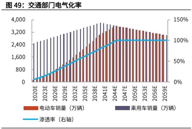 钢铁、电解铝、水泥等行业是能耗大户,也是碳排放大户。钢铁行业的电气化路径主要是从高炉转向电炉,电炉及其设备、耗材仍具有较好的投资机会。根据钢协数据,2019 年我国钢铁行业 90%以上的产能采用高炉 (BOF)技术,而电炉技术(EAF)仅占生产总量的 9%。特别是以废钢为原料 的短流程炼钢技术,碳排放量仅 0.4 吨二氧化碳/吨钢,若使用绿色电力为电炉 供能,则碳排放量可降为 0。水泥的生产过程中需要将水泥窑加热到 1600 摄氏度以上,目前电炉的使用尚未 商业化,投资成本较高。目前较为可行的方法是用沼气、生物质替代化石燃料。从建筑属性来看,可以分为公共建筑、城镇居民建筑和农村居民建筑。从用途来看,供热、制冷、烹饪是中国建筑部门的主要能源消费来源。建筑部门的电气化率仍较低,2017 年仅为 28%。目前,制冷、照明、家电已经实现了 100%电气化,供暖和烹饪的电气化推进较 为缓慢。我国北方城镇普遍实行集中供暖,主要热源为燃煤热电联产和燃煤锅炉。自 2017 年以来,我国北方地区推行“煤改气”、“煤改电”,对建筑部门的电 气化有一定的推动作用。炊事方面,根据清华大学建筑电气化接受程度调研,一方面,住宅炊事用能逐渐向公建转移,应关注公建餐厅电气化;另一方面,住宅炊事电气化最大难点在于改变用户习惯。总之,建筑部门电气化需综合考虑公共部门与居民住宅,也要考虑南北方气候差异。随着人民生活水平提高,家用电器的数量和使用强度呈上升趋势。未来采暖电气化应逐步替代燃煤锅炉,炊事电气化应重点关注餐厅电气化和住宅炊事习惯引导。1)道路交通(小型、轻型):绿色电力为基础的电动车(电池),配套充电桩、换电站;2)道路交通(重型)、铁路或海运:氢能(或氨气),配套加氢站;我们预计,乘用车销量在 2040 年见顶,电动车的渗透率在 2045 年达到 100%, 则电动车的销量将在 2045 年达到 3600 万辆/年。假设单车售价保持下行趋势, 在 2060 年达到 12 万元/辆左右。则电动车领域累计将带来 130 万亿人民币的累计新增投资。