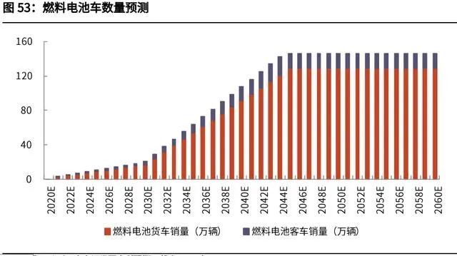 随着电动车保有量的提升,假设车桩比在 2030 年达到 1:1,则 2060 年充电桩总数将超过 5 亿个。综合考虑充电桩的新建需求和更换需求,累计新增投资达到 18.15 万亿元人民币。氢能燃料电池将主要用于重型道路交通(客车、货车)。假设轻型、中型、大型货车的年销量保持在 150、20、70 万辆,燃料电池渗透率在 2045 年达到 40%、 60%、80%,而后保持该渗透率;轻型、中型、大型客车的年销量保持 30、7、 7 万辆,燃料电池渗透率在 2045 年达到 30%、50%、70%,而后保持该渗透率, 则累计新增投资达到 29 万亿元人民币。