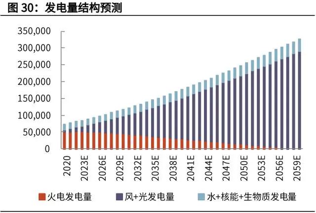 根据我们的上述假设,以 2019 年发电量 7.22 万亿千瓦时为基础,2030 年发电量达到 11.9 万亿千瓦时(和部分机构的预测数据基本一致),2060 年发电量进一步达到 32.71 万亿千瓦时。在总发电量预测的基础上,我们将进一步对不同发电方式未来的发电量及相应的装机需求进行拆分。(1)火电:装机量方面,在 2030 年碳达峰基础上,在经济发展的过程中 2020-2030 年仍需要有一定规模的火电装机支撑发电量增长,因此我们假设火电装机在 2020-2030 年间每年仍将维持增长态势,但增量逐步减少直至 2030 年无新增火电装机;2030-2060 年,火电装机每年将逐步退出电力市场,直至 2060 年碳中和时存量火电装机清零。利用小时数方面,随着火电装机的逐步减少,未来火电将更多用于调峰平抑发电曲线,因此我们假设火电利用小时数从 2020 年的 4080 小时逐步降低至 2030 年的 3080 小时,后续则保持平稳。发电量方面, 在装机量和利用小时数假设的基础上,火电的发电量占比将从 2020 年的 68%逐步减少至 2060 年碳达峰时的 0%。(2)水+核能+生物质:假设未来水+核能+生物质整体的发电量情况保持稳定, 2020-2060 年,在 1.7 万亿千瓦时的基础上每年增长 2%。(3)光伏+风电:在火电发电量逐步减少,水+核能+生物质发电量保持相对稳 健增长的背景下,光伏和风力发电将逐步成为未来最重要的发电方式。发电量占比方面,我们假设光伏+风电发电量中光伏发电的占比维持在 40%;利用小时数方面,假设风电、光伏年利用小时数分别维持在 2400h、1300h;装机量方面, 在总发电量发展、其他发电方式发电量、光伏发电量占比、以及光伏和风电利用小时数等预测的基础上,我们测算得出2030年风电、光伏新增装机量分别为1.53、 1.88 亿千瓦,2060 年风电、光伏新增装机量进一步达到为 2.19、2.7 亿千瓦。(4)储能:由于光伏、风电的不稳定性,必须辅以必要的储能以平抑发电波动。假设储能容配比从 2020 年的 10%逐步提升至 2060 年的 100%,备电时长从 2020 年的 2h 逐步提升至 2060 年的 4h,则储能每年的新增容量将从 2020 年的 0.24 亿千瓦时增长至 2060 年的 19.55 亿千瓦时。需要注意的是,我们对光伏、风电新增装机量的预测源自对部分关键变量的核心假设,如果其未来发生变化(如火电利用小时降低超预期、水+核能+生物质发电量降低、储能配套设施建设超预期等),则未来光伏、风电每年的新增装机量或将超预期增长。