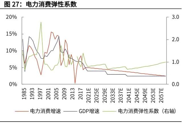 在“碳达峰”、“碳中和”目标的倒逼之下,“能耗指标”将成为重要的抓手, 2021 年全球经济复苏,大宗商品价格上涨动力较强,叠加“碳中和”目标下的 产能压降手段,高能耗产品供给侧约束后,价格有可能进一步提升。我们根据能耗指标,梳理了高耗能类型产品:电解铝、硅铁、电炉锰铁、石墨电 极、烧碱、涤纶、铜等,都有可能成为限制对象。现有的能源系统中,煤、石油是主要力量。据统计年鉴数据,2019 年我国能源 消费总量 48.7 亿吨标煤,其中煤炭、石油、天然气、一次电力及其他能源占比 分别为 57.7%、18.9%、8.1%、15.3%。从用途来看,石油主要用于终端消费(交通、工业),煤炭主要用于中间消费(火力发电),天然气主要用于终端消费(交通、工业、建筑部门)。回顾人类对能源利用的探索历程,实际上是从利用核外电子到利用核内电子的过程,但这恰是宇宙、物质、能源发展的逆过程。二次能源中,对电能的利用是一项伟大的革命,现已成为能源利用的枢纽,从历史上看,“电”也引发了多次生产技术革命。而氢能同作为二次能源,具有可存储的优势,但也因制备和使用效率稍逊而经济性较差,但从能量循环的角度看, 可以有助于碳的减排。锂、氢能同作为可行且具有前景电子存储载体,其重要的原理特点在于,Li+与 H2 都是小粒子,有助于提升物质/能源转换便利性。碳中和的最重要目的就是减少含碳温室气体的排放,采用合适的技术固碳,最终达到平衡。为达到碳中和,我们预计到 2060 年,清洁电力将成为能源系统的配置中枢。供 给侧以光伏+风电为主,辅以核电、水电、生物质发电;需求侧全面电动化,并 辅以氢能。(1)我们采用“自上而下”的测算方法,假设未来 GDP 增速和发电量增速从“十 三五”末期的 5%逐步下降到 2.5%;而由于节能降耗的原因,未来单位 GDP 能 耗逐步下降,电力消费弹性系数将小于 1。(2)假设未来我国总发电量和 GDP 保持同步增长态势且增速一致,假设 GDP 和总发电量增速分别为 2021-2030 年 4%、2031-2040 年 3%、2041-2060 年 2.5%。