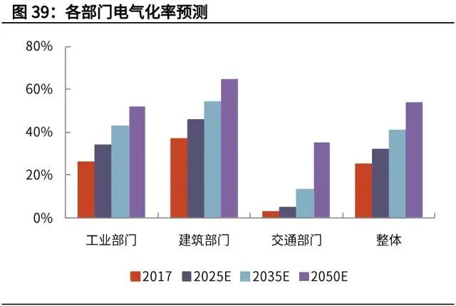 由于能源供给侧向绿色电力转变,所以需求侧的脱碳首先意味着终端电气化。根据国网能源研究院 2019 年 12 月的研究成果,终端电气化率在 2050 年达到 50%以上,其中工业、建筑、交通部门分别达到 52%、65%、35%。